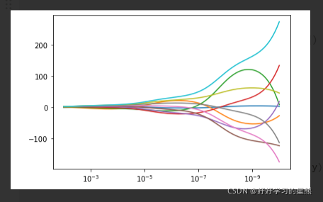 什么是岭迹图:通过绘制不同的正则化系数α下,w的表现。选择较平稳的“喇叭口”时对应的正则化系数α,为最佳正则化系数。