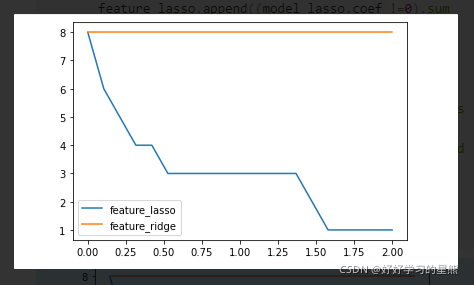 结论:随着正则化系数α的增大,系数为0的特征越来越多,当α>1.75时,只剩下1个特征;而Ridge特征系数只会趋近于0,不会等于0。