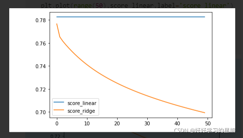 sklearn中自带的数据集基本不存在多重共线性。且通常情况下我们获取的数据集都不会有太大的多重共线性,所以岭回归实际的使用场景有限,且因为岭回归会进行特征过滤,模型也可能会因此效果变差。