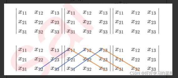 3条↘对角线元素相乘,然后相加,依次减去3条↙对角线元素相乘。
