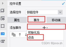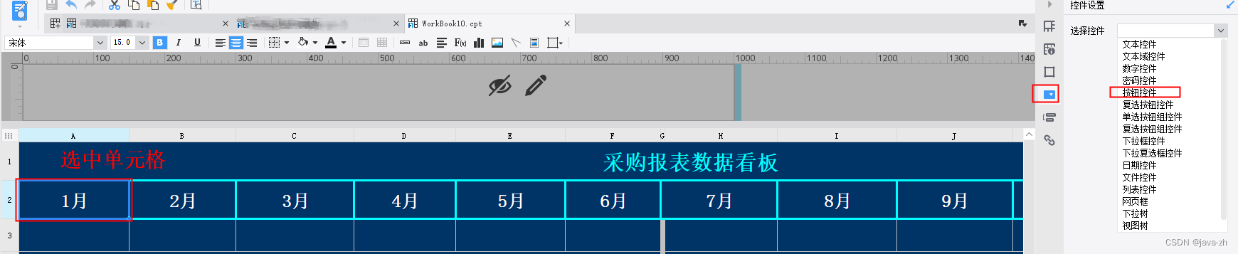 选中单元格 -> 点击右边选中控件功能 -> 选择按钮控件(控件名称可以随便填写) -> 点击事件 ->添加事件(选择点击) -> 添加对应代码