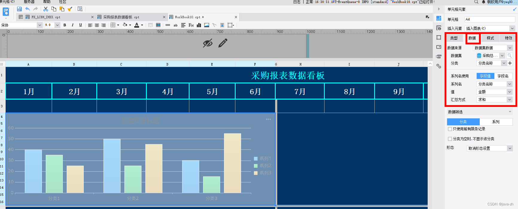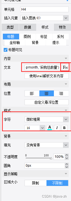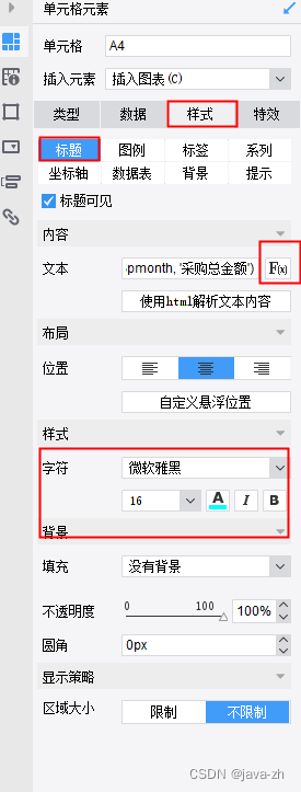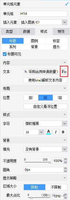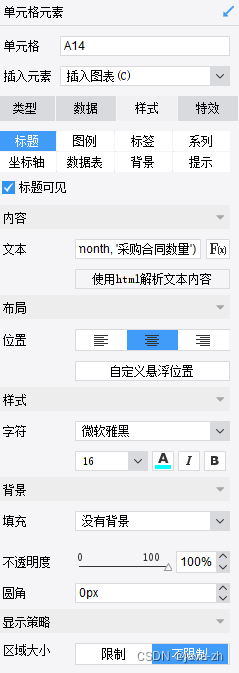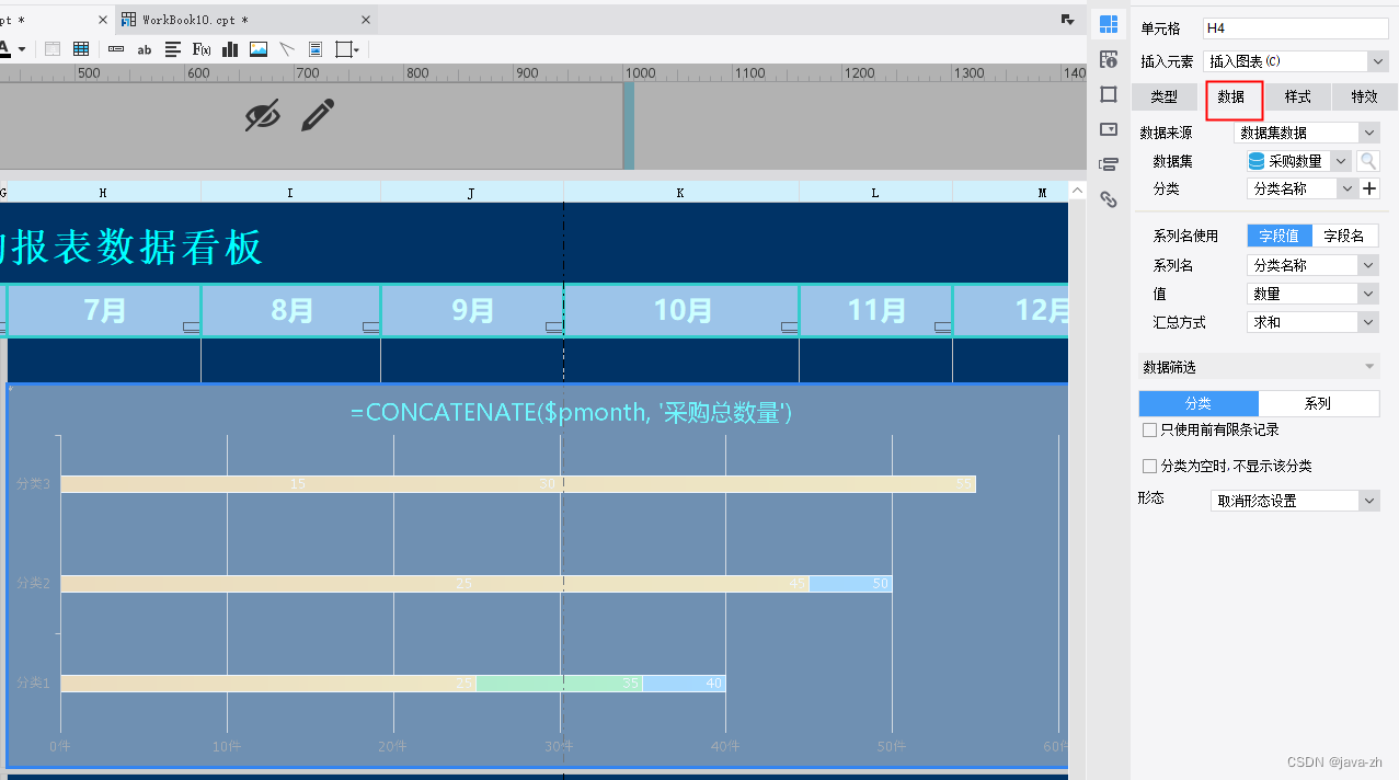 添加标题内容:点击标题函数,内容为:CONCATENATE($pmonth, '采购总金额')