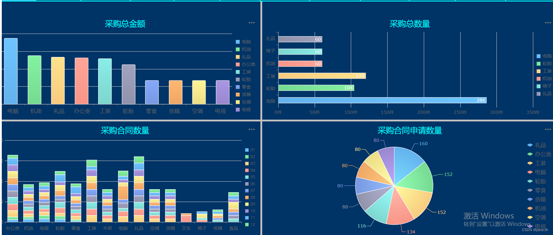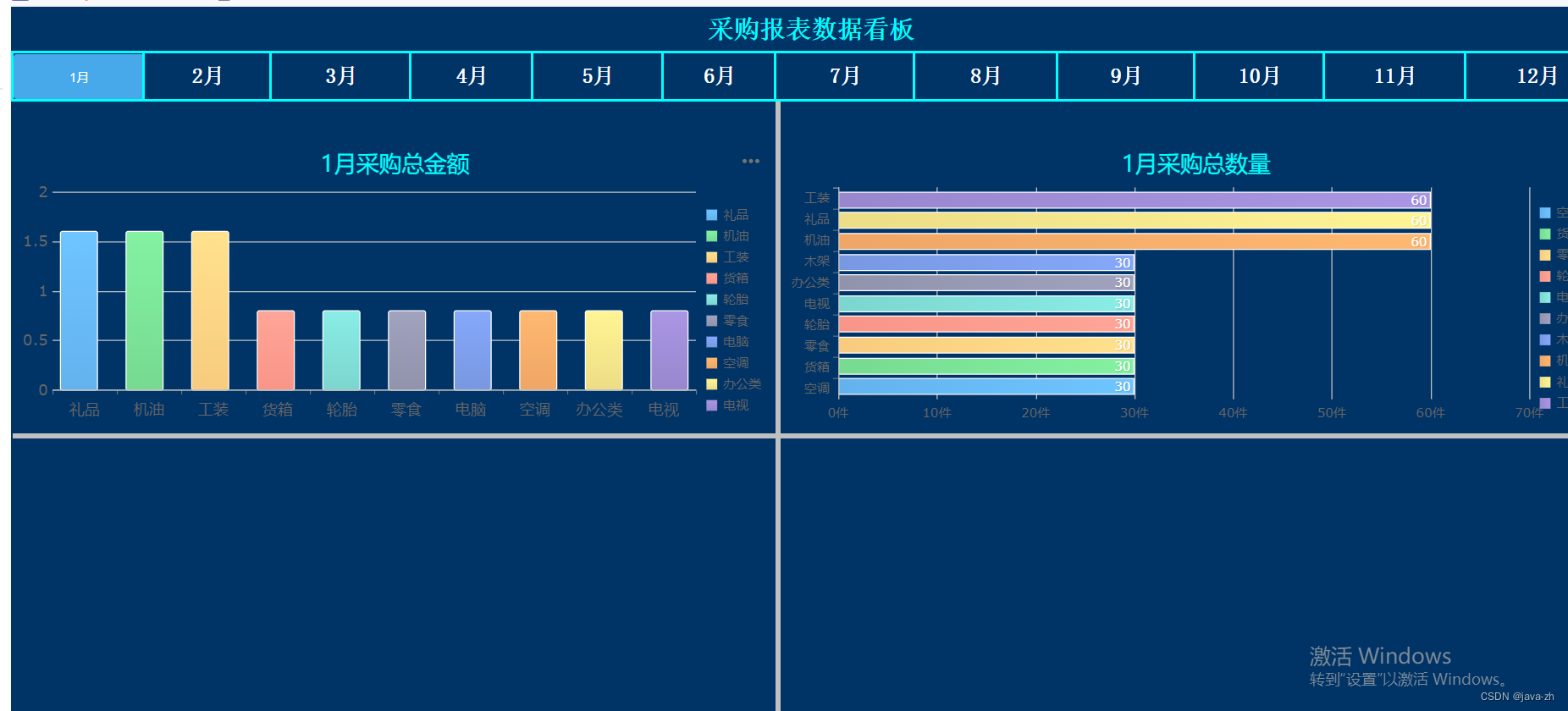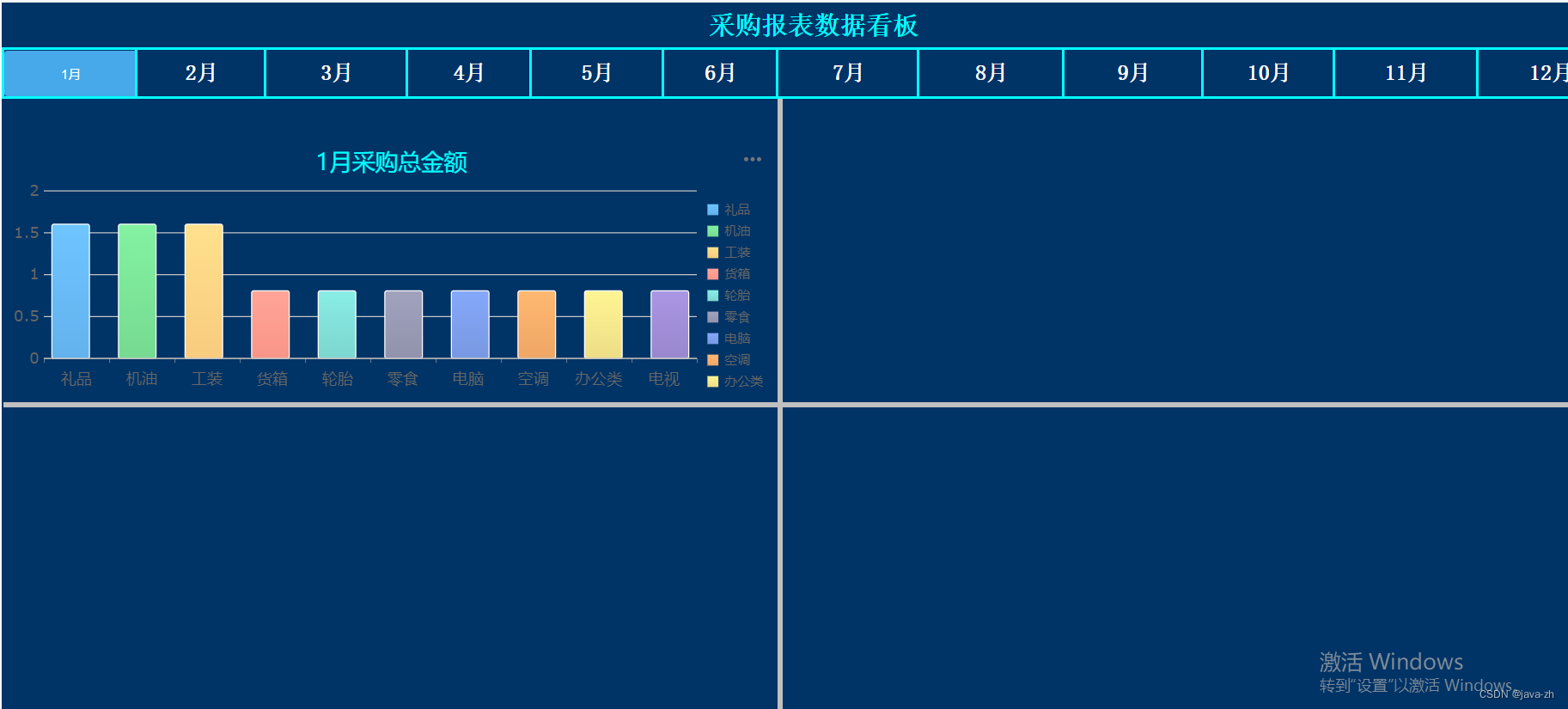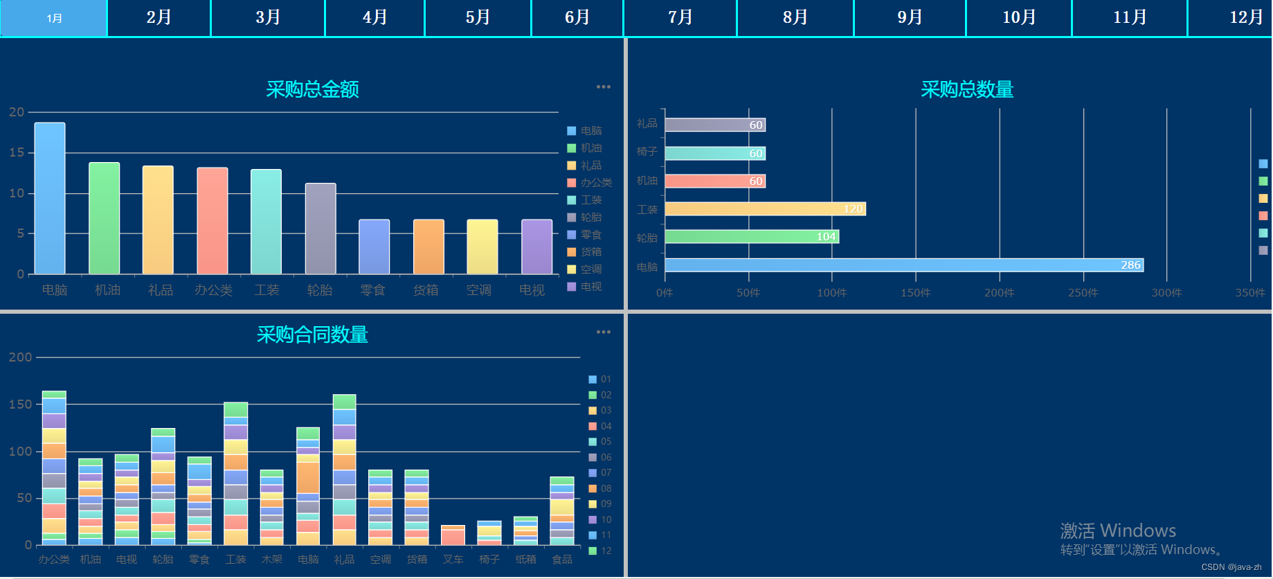 有四个模块,分别是采购总金额,采购总数量,采购合同数量,采购合同申请数量通过点击单元格上的月份,展示不同的月份数据,进行单元格和表格之间的联动