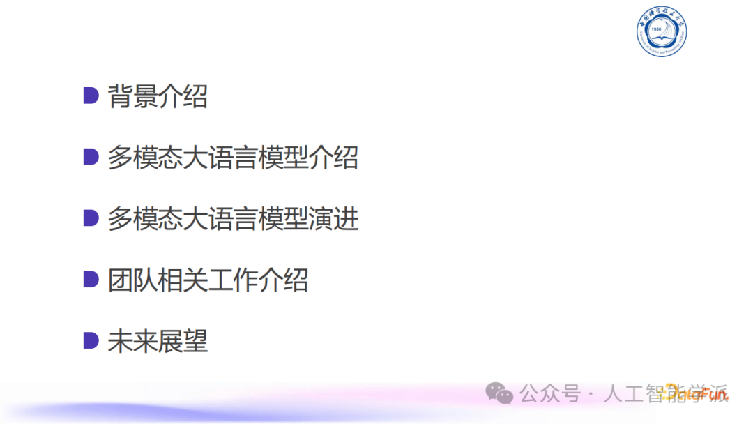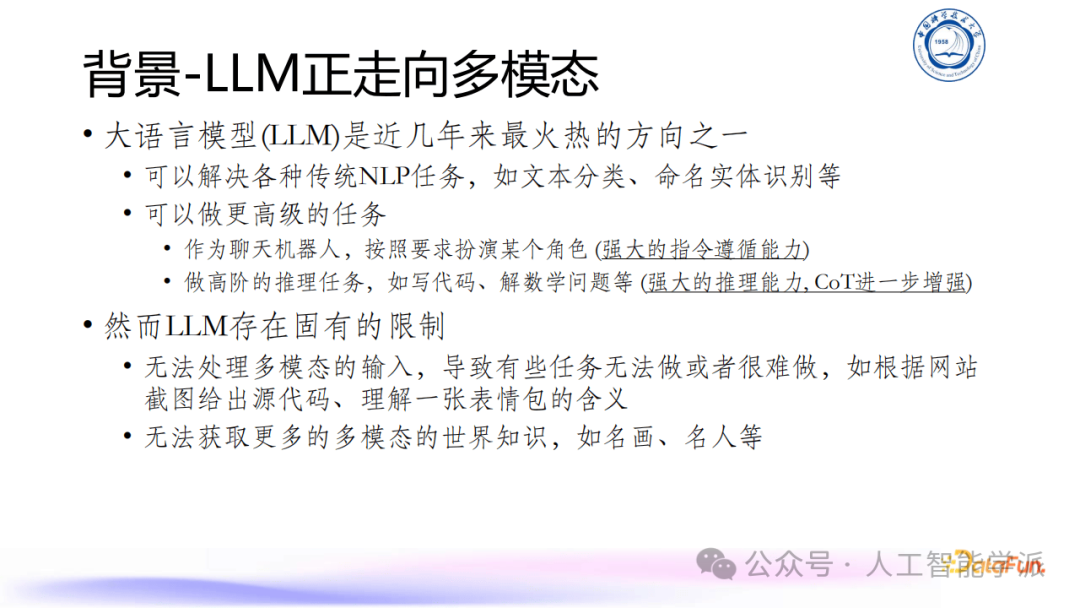 大语言模型(LLM)发展火热,但存在无法处理多模态输入等局限,多模态大语言模型(MLLM)应运而生。MLLM在工业和学术界备受关注,已有众多模型涌现。其能完成传统视觉/多模态任务,如图片描述、计数、定位,也能处理复杂复合型任务,像图表推理、基于视觉感知理解任务。MLLM常用架构含编码器、连接器和大语言模型,数据与训练方法包括模态对齐训练和指令微调训练,评估方式有常规任务Benchmark和专门Benchmark。模型演进呈现出更高分辨率、更丰富输入形式和更多I/O模态支持的趋势,如Qwen - VL提高视觉编码器分辨率,模型从单图输入发展到支持多图、视频输入,输出也可扩展到图文交错、图片、音频、视频等。团队相关工作在幻觉缓解方面,利用外部反馈和视觉基础模型减少模型输出幻觉;长视频理解测评中,指出现存测试集不足,构建Video - MME评估基准,发现字幕对模型视频理解有正向作用等;还在多模态交互体验提升方面探索开源方案VITA,实现屏蔽背景噪音和快速响应新query。未来,MLLM需支持更长context、提升长上下文理解能力、发展多模态Agent、实现轻量化部署,以及统一多模态生成和理解。