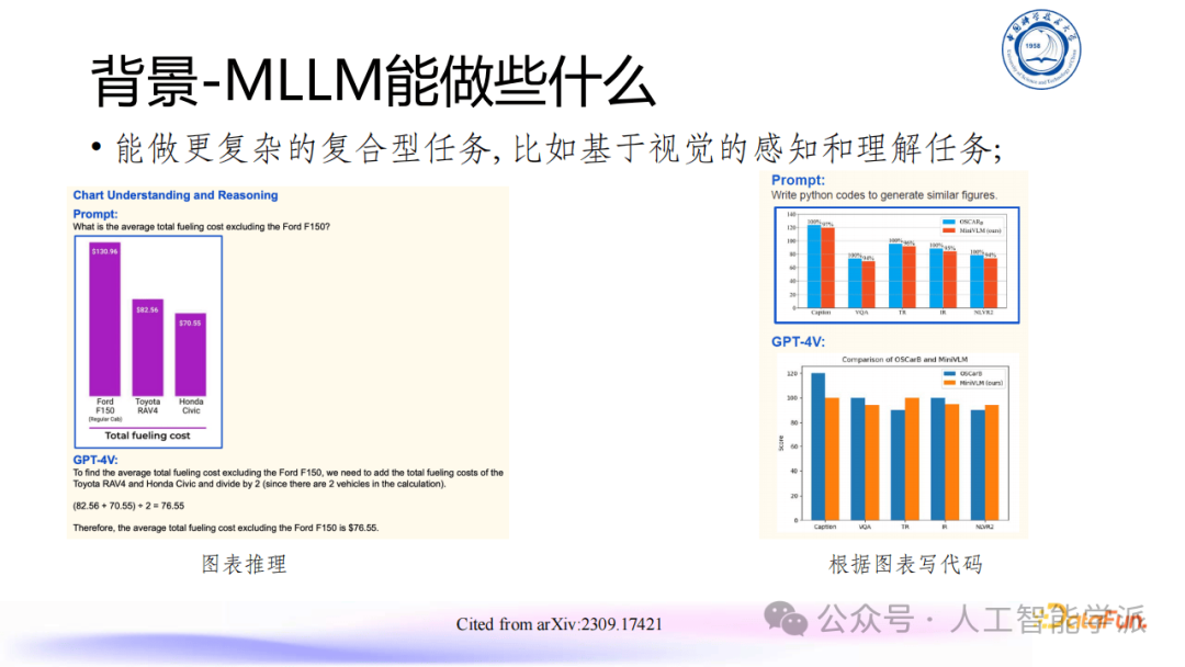 大语言模型(LLM)发展火热,但存在无法处理多模态输入等局限,多模态大语言模型(MLLM)应运而生。MLLM在工业和学术界备受关注,已有众多模型涌现。其能完成传统视觉/多模态任务,如图片描述、计数、定位,也能处理复杂复合型任务,像图表推理、基于视觉感知理解任务。MLLM常用架构含编码器、连接器和大语言模型,数据与训练方法包括模态对齐训练和指令微调训练,评估方式有常规任务Benchmark和专门Be