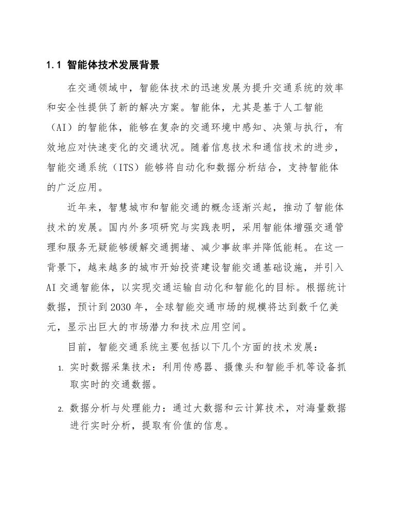 在交通领域中,智能体技术的迅速发展为提升交通系统的效率和安全性提供了新的解决方案。智能体,尤其是基于人工智能(AI)的智能体,能够在复杂的交通环境中感知、决策与执行,有效地应对快速变化的交通状况。随着信息技术和通信技术的进步,智能交通系统(ITS)能够将自动化和数据分析结合,支持智能体的广泛应用。
