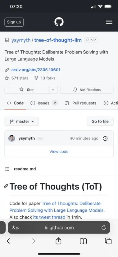 普林斯顿大学和Google的研究人员推出了语言模型推理框架“思维树"(tree of thought),简称ToT,并表示ToT能让Al大模型推理能力显著提高ToT,它推广了流行的思想链方法来提示语言模型,并允许探索连贯的文本单位(思想),作为解决问题的中间步骤。ToT允许LM通过考虑多种不同的推理路径和自我评估选择来决定下一步行动,并在必要时展望未来或回溯以做出全球选择,从而进行深思熟虑的决策。实验表明,ToT显著增强了语言模型在三个需要非平凡规划或搜索的新任务上解决问题的能力:24游戏、创意写作和迷你填字游戏。例如,在24场比赛中,虽然具有思想链的GPT-4解决了4%的任务,但ToT的方法的成功率为74%论文链接��[2305.10601] Tree of Thoughts: Deliberate Problem ...Github 开源代码��GitHub - ysymyth/tree-of-thought-llm: Tree of Thou...GitHub - kyegomez/the-compiler: Seed, Code, Harves...#最新资讯##辅助工具#