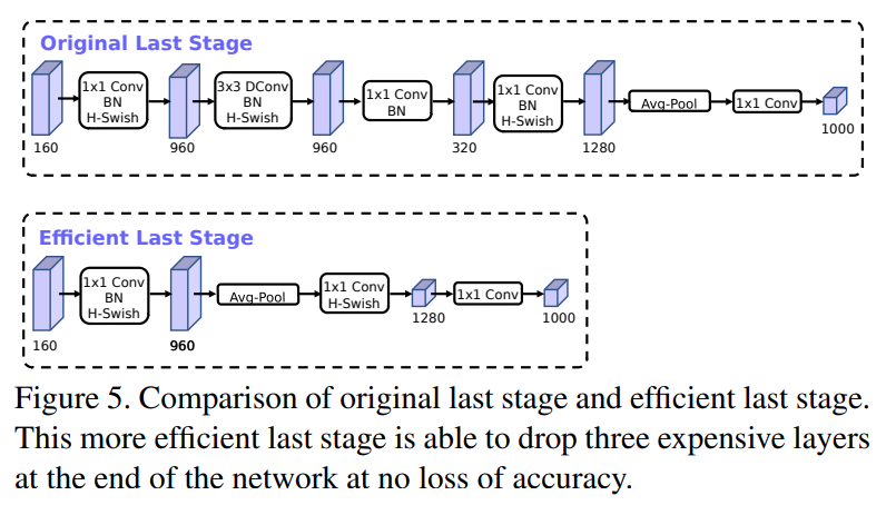 主要创新点:使用NMS搜索得到网络的最优参数、新增加SE注意力机制、修改激活函数(h-swish)、减少第一个卷积层的卷积核个数( 32-> 16)、精简末端网络结构