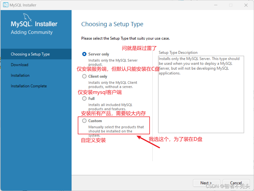 MySQL :: Download MySQL Installer (Archived Versions) 1、打开installer,选择安装类型后,点击下一步2、 此时我们右边可能是空的,不知道应该选哪些,参考这篇文章的方法,先回退到上一步,选择其他的方式,再进来自定义方式目录就有了Mysql安装配置教程(超详细)(C盘、D盘均可安装)_nysql安装路径设置-CSDN博客如此操作:3、或者如