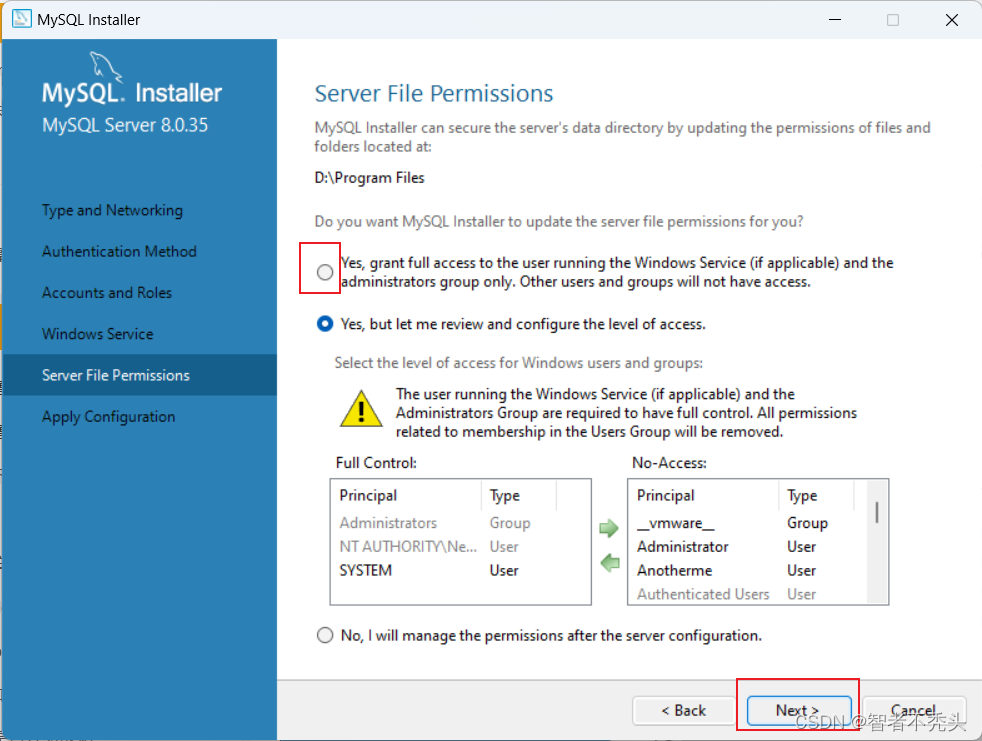 2、 此时我们右边可能是空的,不知道应该选哪些,参考这篇文章的方法,先回退到上一步,选择其他的方式,再进来自定义方式目录就有了Mysql安装配置教程(超详细)(C盘、D盘均可安装)_nysql安装路径设置-CSDN博客