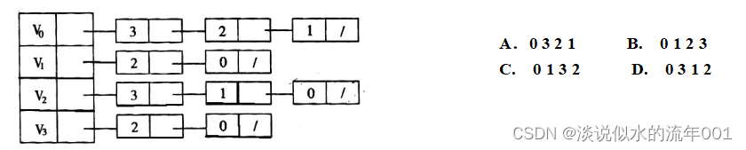 ( D )12. 已知图的邻接表如下所示,根据算法,则从顶点0出发按深度优先遍历的结点序列是