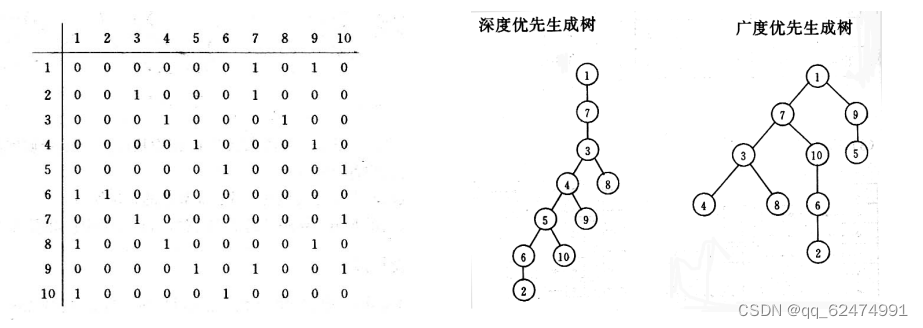 3. 已知二维数组表示的图的邻接矩阵如下图所示。试分别画出自顶点1出发进行遍历所得的深度优先生成树和广度优先生成树。