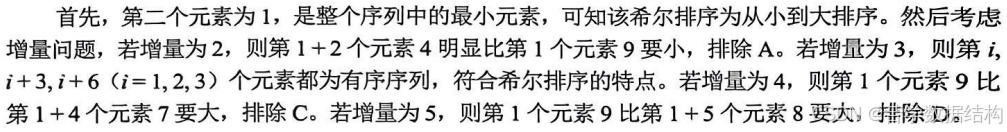 解析:希尔排序将序列分成若干组,记录只在组内进行交换。由观察可知,经过一趟后9和-1交换,7和4交换,可知增量为4。