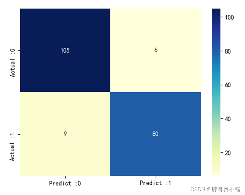 从上图可以看出,实际为0预测不为0的 有6个样本;实际为1预测不为1的 有9个样本,整体预测准确率良好。