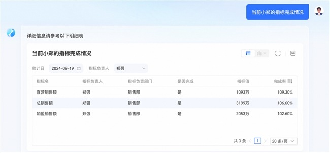 对于模糊语义的识别,当前智能问数(ChatBI)也能轻松识别并理解。如提问中「小郑」定位到「郑强」。