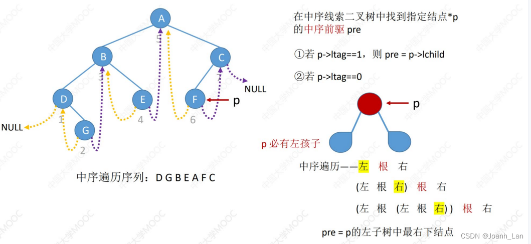 在中序线索二叉树中找到指定结点*p的中序前驱\color{red}中序前驱中序前驱pre