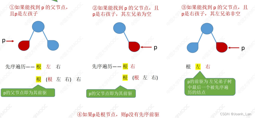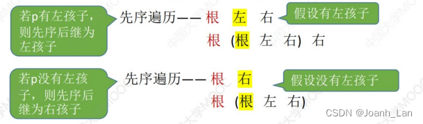 先序遍历中,左右子树中的结点只可能是根的后继,不可能是前驱