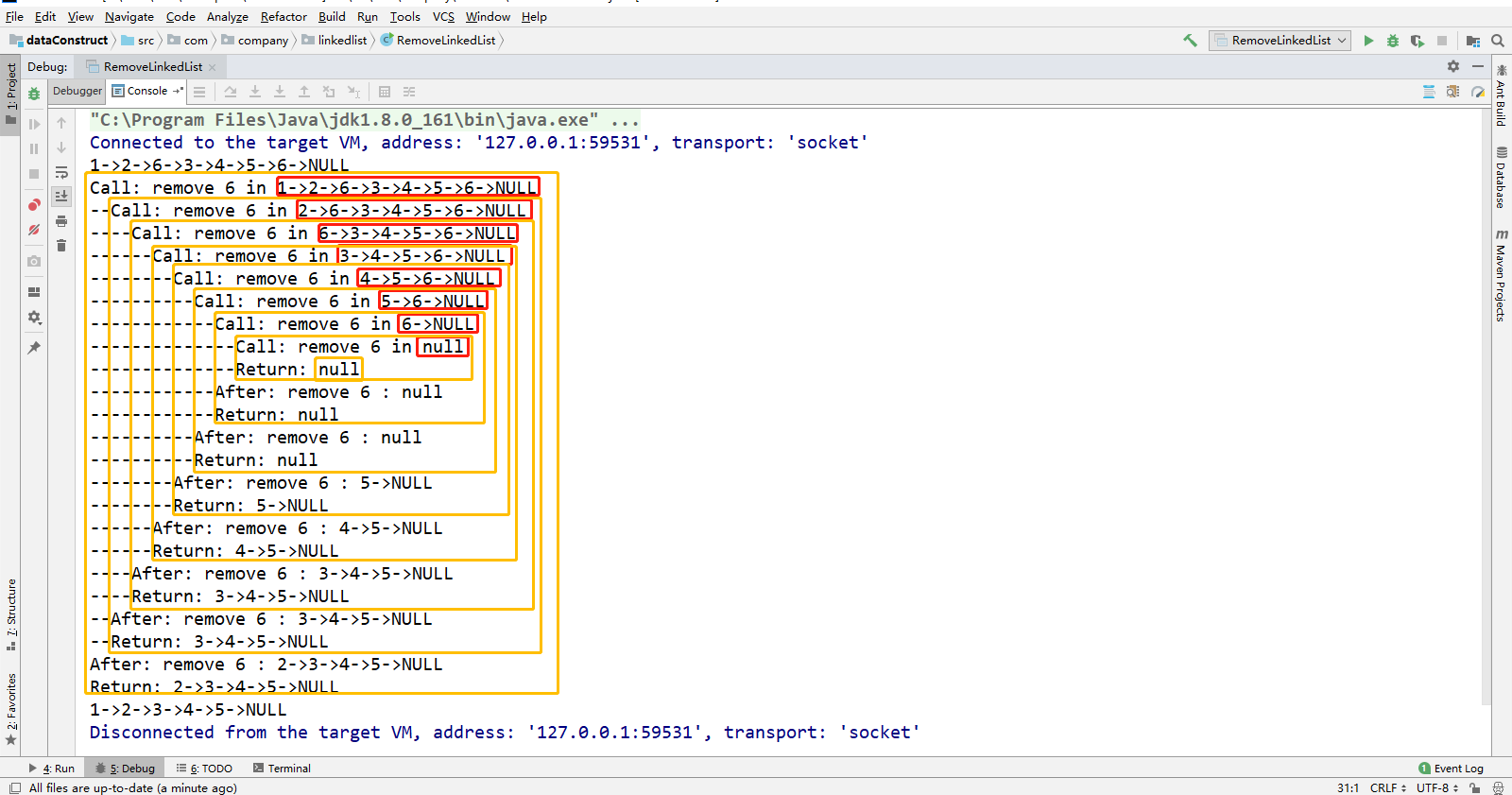 1 package com.company.linkedlist; 2 3 /** 4 * @ProjectName: dataConstruct 5 * @Package: com.company.linkedlist 6 * @ClassName: RemoveLinkedList 7 * @Author: biehl 8 * @Description: ${description} 9 * @Date: 2020/3/9 9:48 10 * @Version: 1.0 11 */ 12 public class RemoveLinkedList { 13 14 // 内部类 15 class ListNode { 16 17 int val; 18 ListNode next; 19 20 ListNode(int x) { 21 val = x; 22 } 23 24 /** 25 * 将数组转换为链表结构 26 * <p> 27 * 链表节点的构造函数,使用arr为参数,创建一个链表,当前的ListNode为链表头节点。 28 * <p> 29 * 将整个链表创建完成以后,这个构造函数是一个节点的构造函数,我们最终呢, 30 * 相当于把我们的当前构造的这个节点作为头节点。 31 * 32 * @param arr 33 */ 34 public ListNode(int[] arr) { 35 // 首先,判断数组arr是否合法,数组不能为空,必须包含元素 36 if (arr == null || arr.length == 0) { 37 throw new IllegalArgumentException("arr can not be empty."); 38 } 39 40 // 让数组索引为0的元素即第一个元素赋值给存储链表节点元素的val。 41 this.val = arr[0]; 42 // 遍历数组,将数组中的每一个元素都创建成新的ListNode节点。链接到前一个节点上,形成这样的一个链表。 43 // 创建一个节点,从this开始,将之后的节点都链接到此节点的后面。 44 ListNode current = this; 45 for (int i = 1; i < arr.length; i++) { 46 // 让从this开始,将之后的节点都链接到此节点的后面。 47 current.next = new ListNode(arr[i]); 48 // 让current这个几点。每次循环都向后移动一个位置,将后面的节点都依次进行挂接。 49 current = current.next; 50 } 51 // 最后,this就是我们用上面的循环创建的链表相对应的头部节点head。 52 } 53 54 /** 55 * 为了方便在main函数中观察链表。 56 * <p> 57 * 返回的是以当前节点为头部节点的链表信息字符串。 58 * <p> 59 * 注意,这里的ListNode是一个节点哈,不是一个链表结构。 60 * 61 * @return 62 */ 63 @Override 64 public String toString() { 65 StringBuilder stringBuilder = new StringBuilder(); 66 // 从自身开始循环 67 ListNode current = this; 68 // 循环遍历,只要current不为空,就进行操作 69 while (current != null) { 70 // 将当前节点的val值进行拼接 71 stringBuilder.append(current.val + "->"); 72 // 将current向下一个节点进行移动 73 current = current.next; 74 } 75 // 表示达到了链表的尾部。 76 stringBuilder.append("NULL"); 77 return stringBuilder.toString(); 78 } 79 } 80 81 /** 82 * 根据递归深度生成一个深度字符串。 83 * 84 * @param depth 85 * @return 86 */ 87 private String generateDepthString(int depth) { 88 StringBuilder stringBuilder = new StringBuilder(); 89 for (int i = 0; i < depth; i++) { 90 // 每次循环添加两个中划线,方便观察递归效果。深度越深,中划线越多。 91 stringBuilder.append("--"); 92 } 93 return stringBuilder.toString(); 94 } 95 96 97 /** 98 * @param head 以head为头部节点的链表。 99 * @param val 待删除元素。 100 * @param depth 递归深度,每一个函数在内部调用一次自己,可以理解为递归深度多了一。 101 * 递归深度帮助理解递归的一个变量。 102 * @return 103 */ 104 public ListNode removeElements(ListNode head, int val, int depth) { 105 // 根据递归深度生成一个深度字符串。 106 String depthString = generateDepthString(depth); 107 // 首先打印一下深度字符串。打印的是在这个递归深度下。 108 System.out.print(depthString); 109 // 复用了ListNode的toString方法。表示,在head为头部节点的链表删除val这个元素。 110 System.out.println("Call: remove " + val + " in " + head); 111 112 if (head == null) { 113 System.out.print(depthString); 114 System.out.println("Return: " + head); 115 // 此时,不需要任何逻辑。 116 return head;// 此时,return返回head还是return null都是一样的。 117 } 118 119 // 也可以写成如下写法,让返回值直接存储到head的下一个节点中。递归深度每次加一。 120 ListNode res = removeElements(head.next, val, depth + 1); 121 System.out.print(depthString); 122 System.out.println("After: remove " + val + " : " + res); 123 124 ListNode ret; 125 if (head.val == val) { 126 // 删除头部节点 127 ret = res; 128 } else { 129 // 不删除头部节点 130 head.next = res; 131 ret = head; 132 } 133 System.out.print(depthString); 134 System.out.println("Return: " + res); 135 136 return ret; 137 } 138 139 140 public static void main(String[] args) { 141 int[] arr = new int[]{1, 2, 6, 3, 4, 5, 6}; 142 // 创建ListNode 143 ListNode head = new RemoveLinkedList().new ListNode(arr); 144 // 打印head,注意,这里的head虽然是一个头部节点,但是覆盖了toString方法,这里的head是以head作为头部节点的整个链表对应的字符串。 145 System.out.println(head); 146 // 创建本来对象 147 RemoveLinkedList removeLinkedList = new RemoveLinkedList(); 148 // 调用方法,删除待删除元素的节点。递归深度,默认是0 149 ListNode removeElements = removeLinkedList.removeElements(head, 6, 0); 150 // 打印输出即可 151 System.out.println(removeElements); 152 } 153 154 }