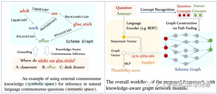 这些基于神经网络的方法通过与神经编解码模型的结合得到了改进,但要处理复杂的多跳关系需要更特殊的设计才能进行多跳常识推理。结构化知识提供了丰富的常识信息,并充当了关系归纳偏差,这推动了近年来在符号空间和语义空间之间进行常识知识融合的多跳推理研究。Bauer等人[15] 提出了双向注意力和指针生成解码器,用于有效的多跳推理和答案生成,其中外部常识知识通过ConceptNet中对关系路径进行选择得到。变分推理网络(VRN)[16] 通过reasoning-graph嵌入技术进行多跳逻辑推理,同时能够解决主题实体识别中的不确定性问题。KagNet[17] 从ConceptNet中构建模式子图,并通过GCN、LSTM和基于层次路径的注意力机制来学习基于路径的关系表示。CogQA[18] 将隐式抽取和显式推理相结合,提出了一种基于BERT和GNN的多跳QA认知图谱模型。