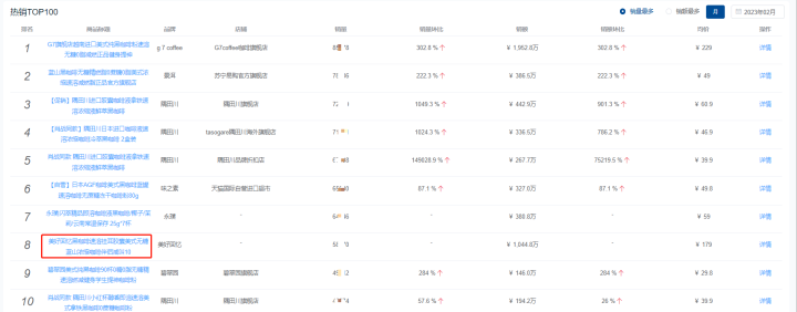 根据具体数据可以看出,2月份在天猫平台上,咖啡销额TOP10的品牌分别有雀巢、隅田川、美好回忆、g 7 coffee、星巴克、味之素、三顿半、永璞、旧街场和SINLOY等品牌。其中,雀巢品牌的市占约10%,排名第一;隅田川和美好回忆分别以7%和5%的市占位列第二名和第三名。