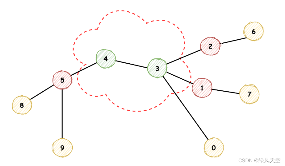 所以每次都删除掉最外围的叶子节点(也就是入度为1的节点),删掉叶子节点之后,与它们相连的入度为2的节点就会变成新的叶子节点,这样新一轮继续删除叶子节点,更新与它们相连的节点的度数。
