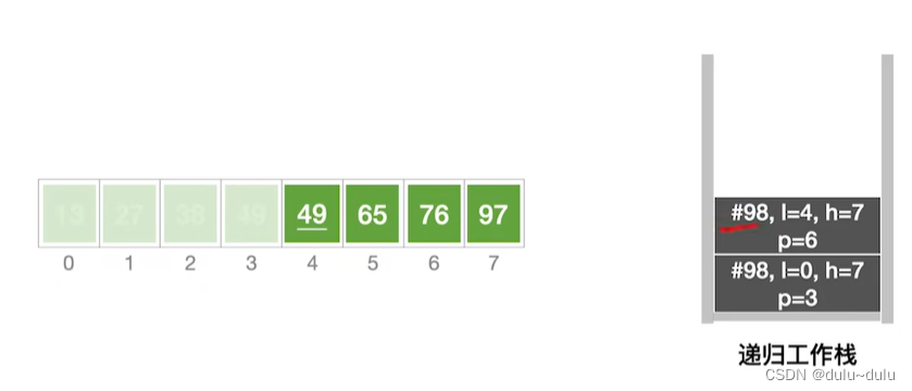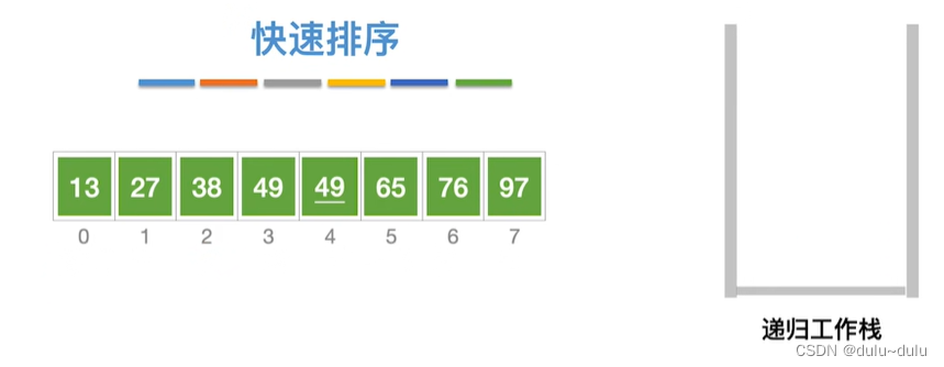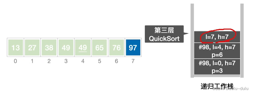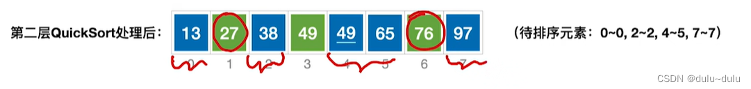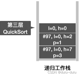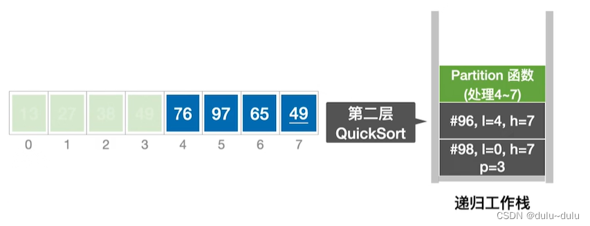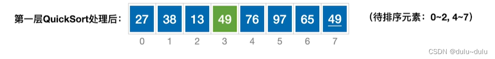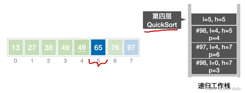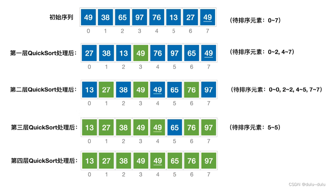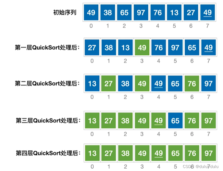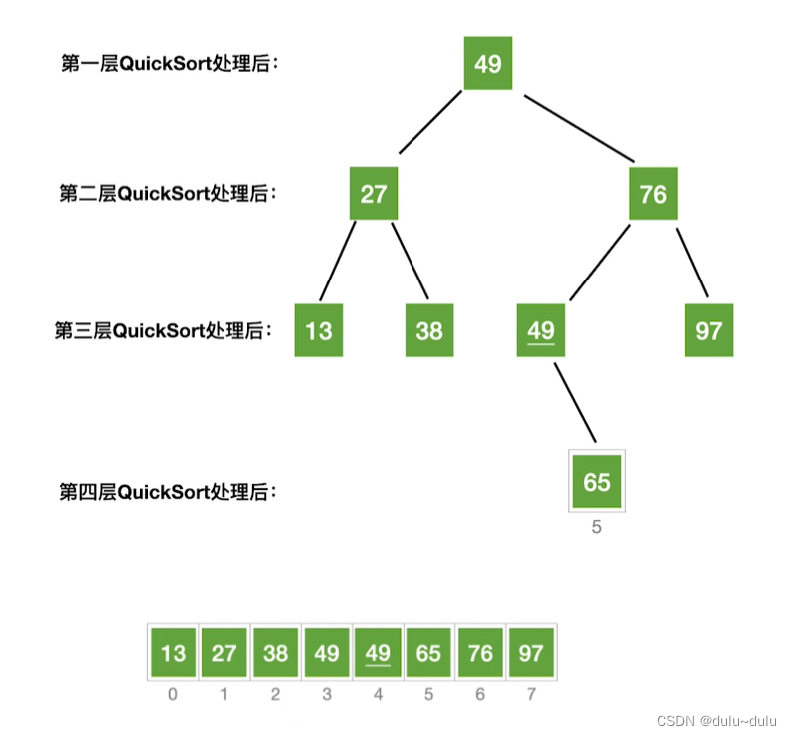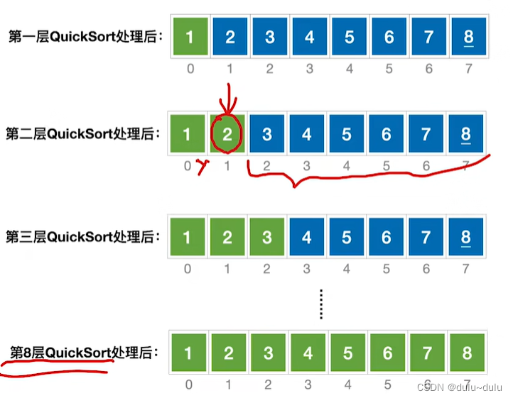 ④所以,对于下表的数据元素,需要经历4层QuickSort,每一层QuickSort只需要处理剩余待排序元素, 时间复杂度不超过O(n)。