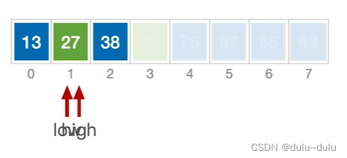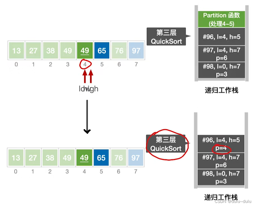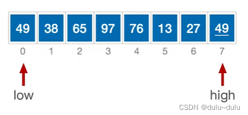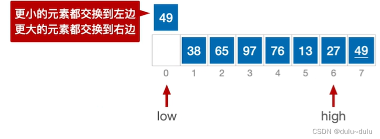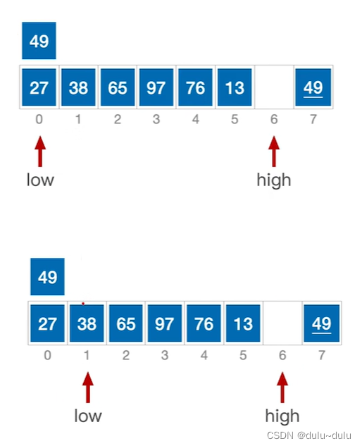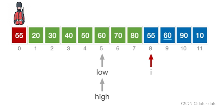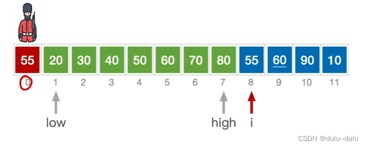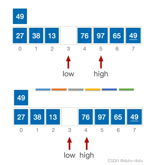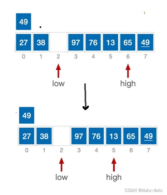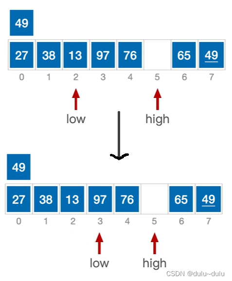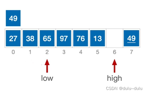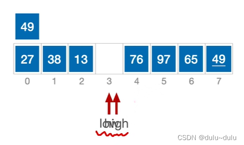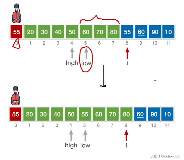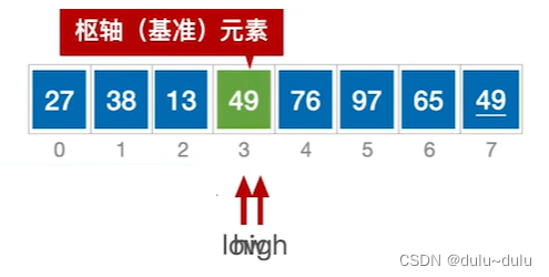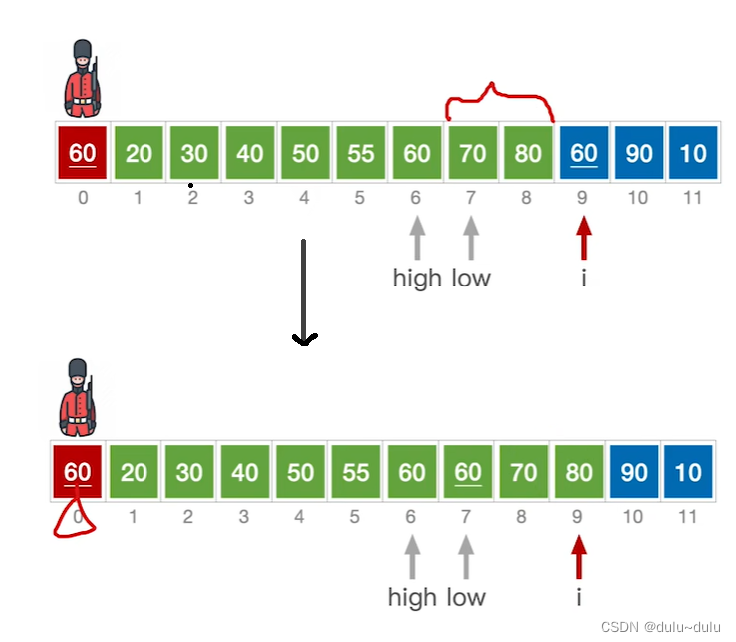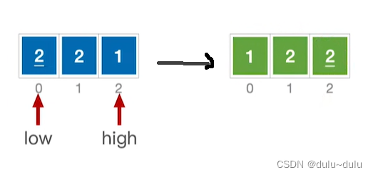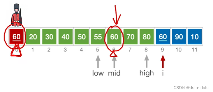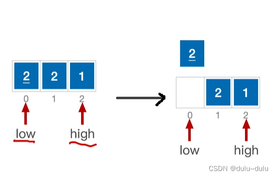 ③ low指针右移指向2,由于2和枢轴元素相等,所以位置不变,low指针继续右移。此时,low=high,将枢轴元素放到low和high共同指向的位置: