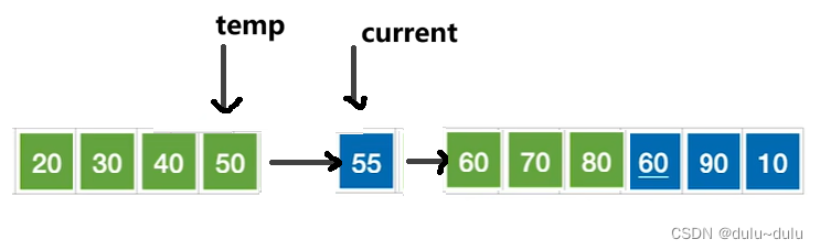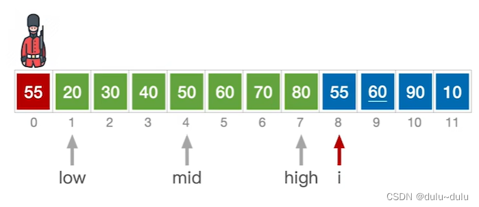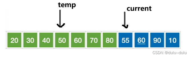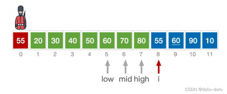于是high=mid-1;mid=high+low/2,mid指针指向60,由于60>55,所以55应该插入到60左边的区域: