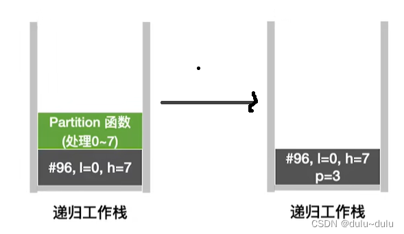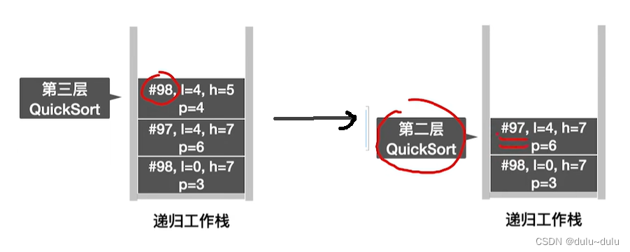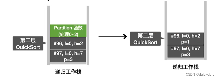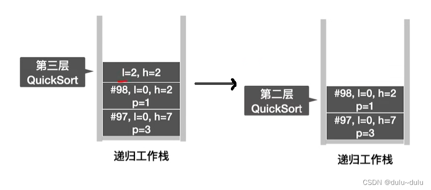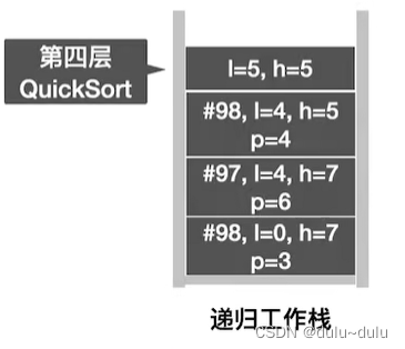 如下图所示,每一层的QuickSort会把当前需要处理的子区间继续划分为两个部分。把n个元素组织成二叉树,二叉树的层数就是递归调用的层数: