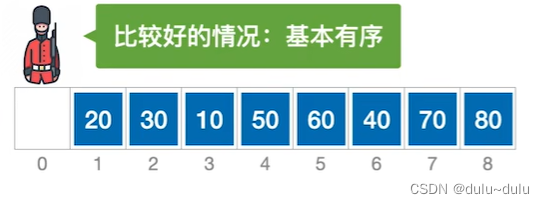 最好的情况:若原始表中的元素本来就是有序的,那么共n-1趟处理,每一趟只需要对比关键字1次不用移动元素。最好时间复杂度为O(n)。