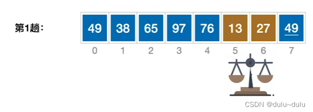 第一趟将第1个元素与后面的7个元素进行比较,将原序列划分为长度为3和4的两个子表,比较7次;