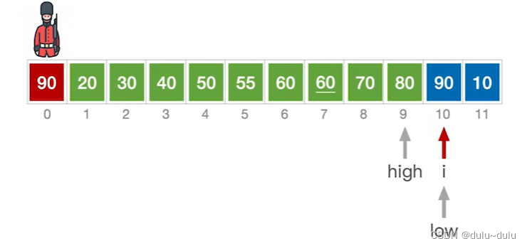 下一个需要处理的数据元素是90,同样,当low>high时,停止折半查找,由于low>i-1,所以不用移动任何元素。