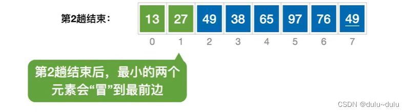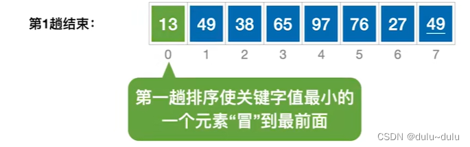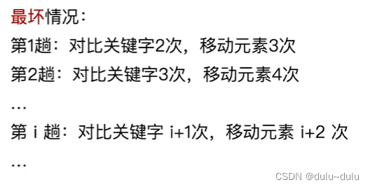 时间复杂度主要来自对比关键字、移动元素若有 n个元素,则需要 n-1趟处理。