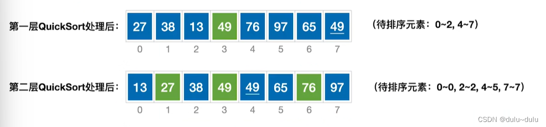 快速排序算法:对n个元素进行第一趟快速排序后,会确定一个基准元素,根据这个基准元素在数组中的位置,有两种情况:①基准元素在数组的首端或尾端,接下来对剩下的 n-1 个元素构成的子序列进行第二趟快速排序,再确定一个基准元素。这样,在两趟排序后就至少能确定两个元素的最终位置,其中至少有一个元素是在数组的首端或尾端。②基准元素不在数组的首端或尾端,第二趟快快速排序对基准元素划分开的两个子序列分别进行一次划分,两个子序列各确定一个基准元素。这样,两趟排序后就至少能确定三个元素的最终位置。