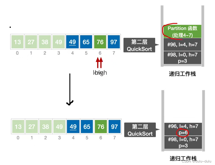 例如下图,将左右两个子表都进行一次划分称为"一趟"排序,即对所有尚未确定最终位置的所有元素都进行一遍处理。而一次"划分",则是针对左子表或右子表的一次划分。