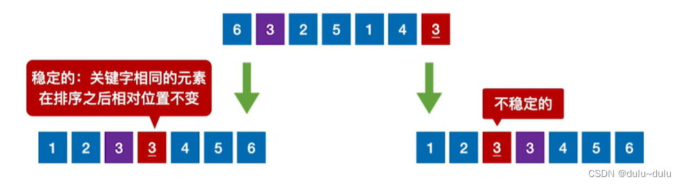 对于排序算法的评价指标,除了看这个排序算法的时间复杂度和空间复杂度外,还需要关注算法的稳定性。若待排序表中有两个元素Ri和Rj,其对应的关键字相同即,且在排序前Ri在Rj的前面,若使用某一排序算法排序后,Ri仍然在Rj的前面,则称这个排序算法是稳定的,否则称排序算法是不稳定的。