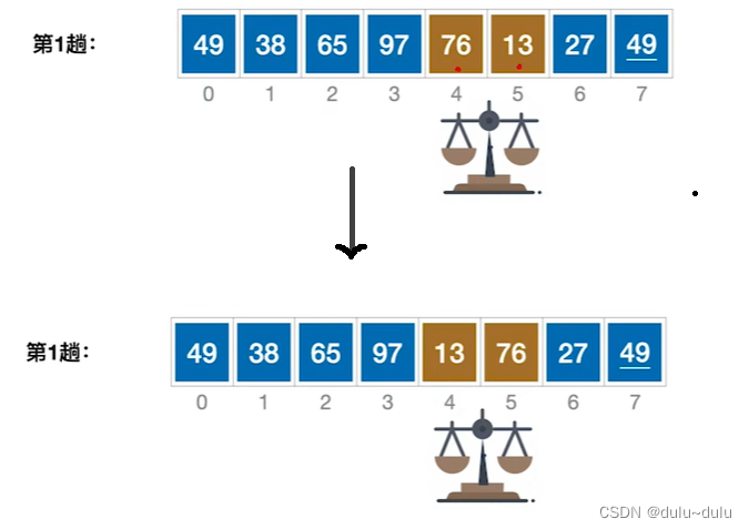 冒泡排序:进行一趟排序算法后,会有一个元素在其最终位置。要么在开头,要么在结尾。