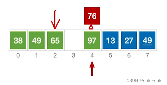 65继续与之前的元素对比,由于65大于之前的元素,所以不用移动,97同理。当移到76这个数据元素时,将76这个元素与之前已经排好序的元素依次对比:97大于76,所以将97后移一位:
