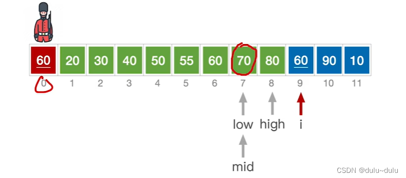 于是low=mid+1,mid=low+high/2,由于70>60,所以60应该插入在70左边的位置: