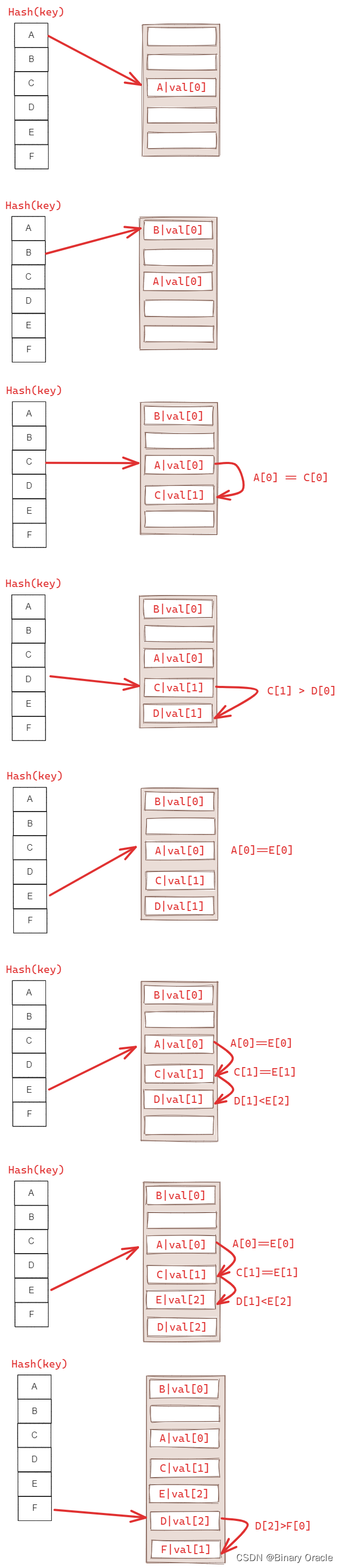 - 在查找元素时,根据元素的哈希键计算出对应的槽位,并遍历该槽位的链表桶,搜索具有相同哈希键的元素