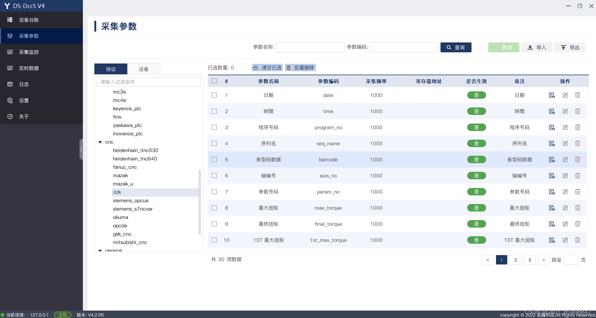 2. DDK拧紧机的采集数据点已经跟随采集协议预置,可以根据需要删除不需要采集的参数。