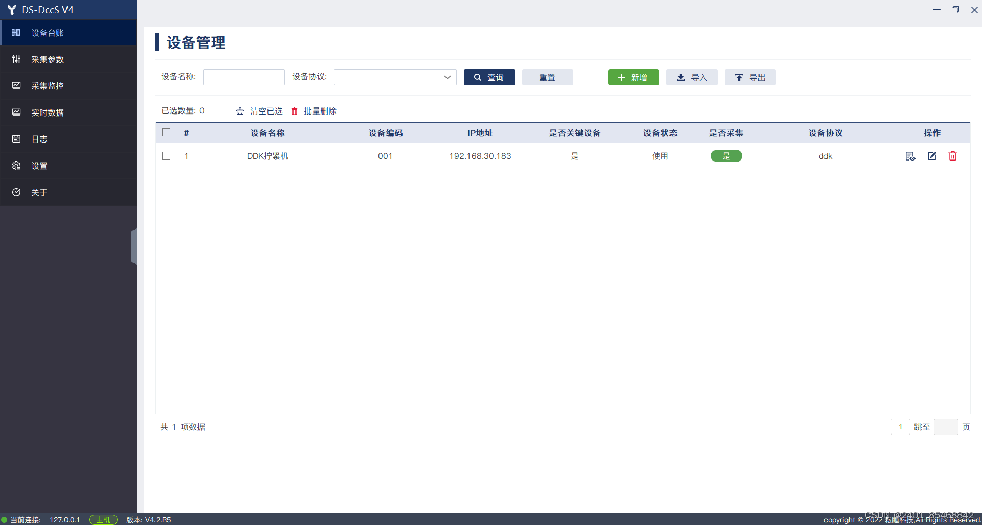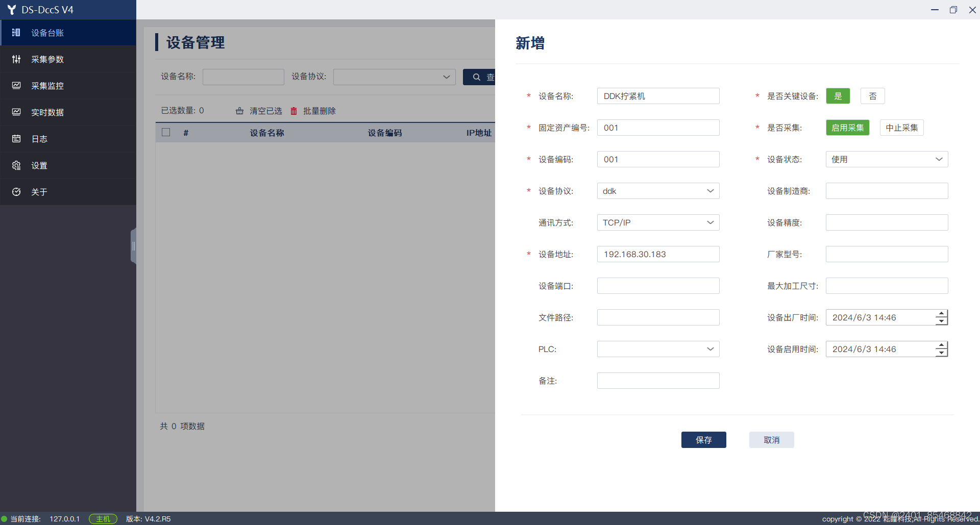 1. 添加DDK拧紧机设备,【设备台账】页面中,点击新增设备,输入设备名称,设备协议(选择DDK),设备地址(DDK拧紧机地址)以及设备端口(设备端口号)