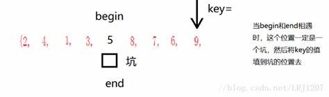 选取左边为key,从右边第一个元素依次与key进行比较,如果比key小则填入左边的坑位,而自己形成一个新的坑位。然后左边依次与key进行比较,如果比key大则填入右边的坑位;反复进行下去。直到L,R相遇,此时,必定是坑位,再将key值填入。