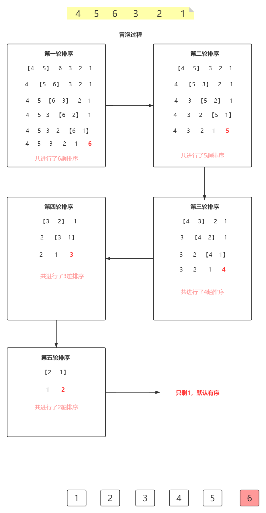 循环。因为冒泡是逐个比较的,发现在第二轮的循环中,两两比较均符合有序,说明整个数列此时已经有序了 - break跳出外层循环,结束排序即可