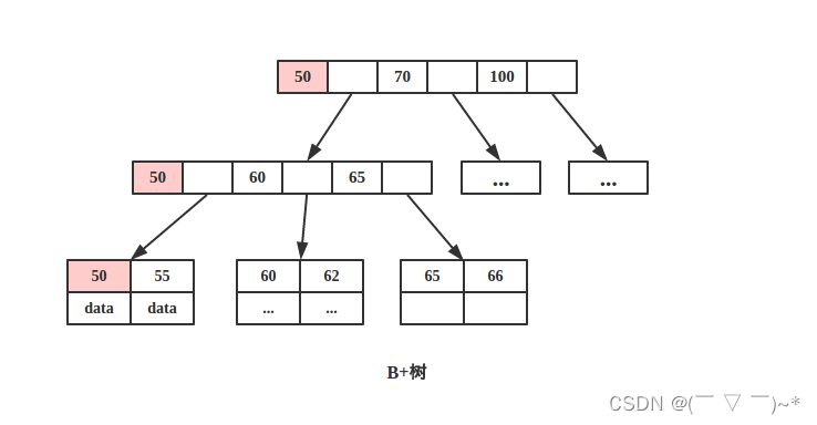 如下所示B-树/B+树查询节点 key 为 50 的 data。