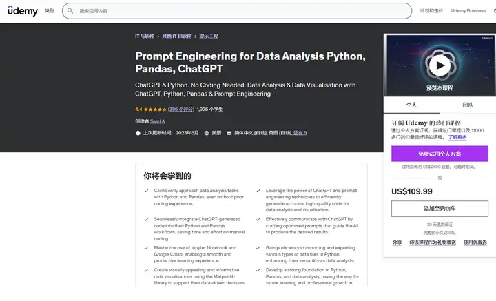 AI视频教程下载-数据分析中的提示工程:Python、Pandas、ChatGPT