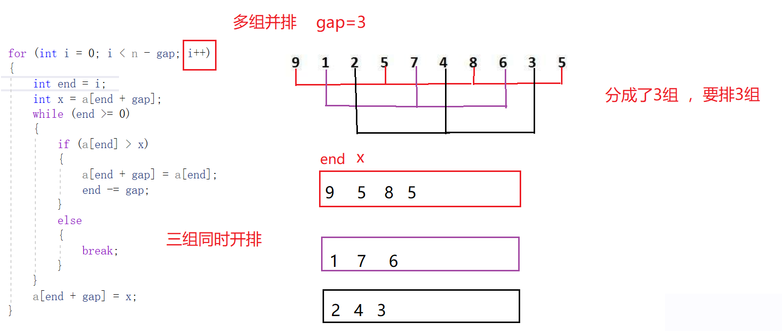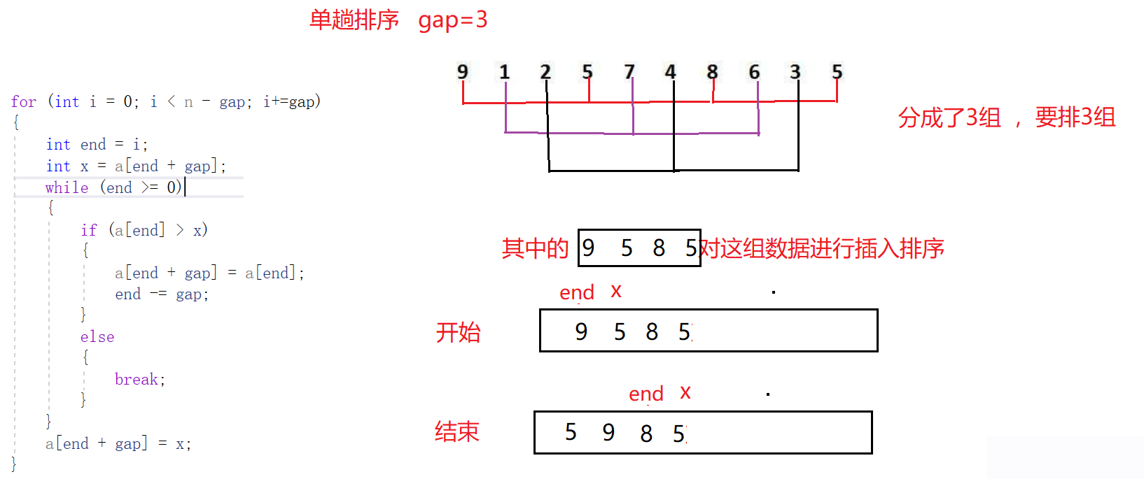 和前面的直接插入相同,就是把原来的间隔为1,现在变为gap了,每组分别进行预排序