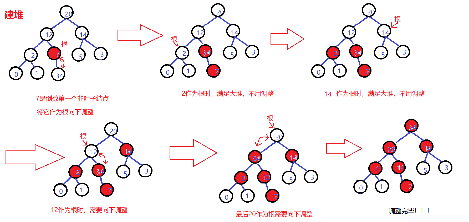 1、将待排序的序列构造成一个大堆,根据大堆的性质,当前堆的根节点(堆顶)就是序列中最大的元素;