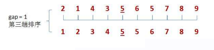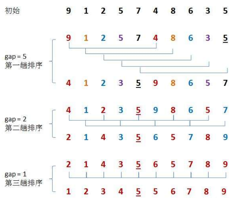 - 1、先选定个小于n的数字作为gap,所有距离为gap的数分为一组进行预排序(直接插入排序)