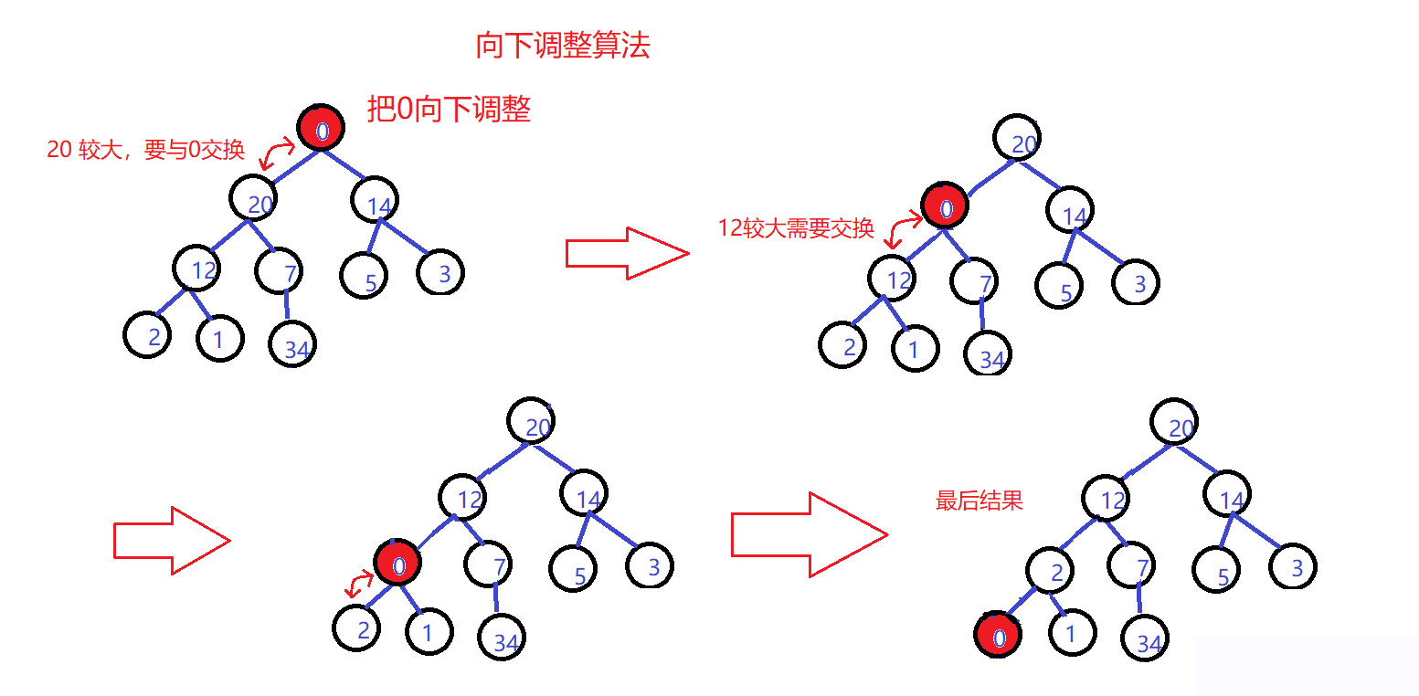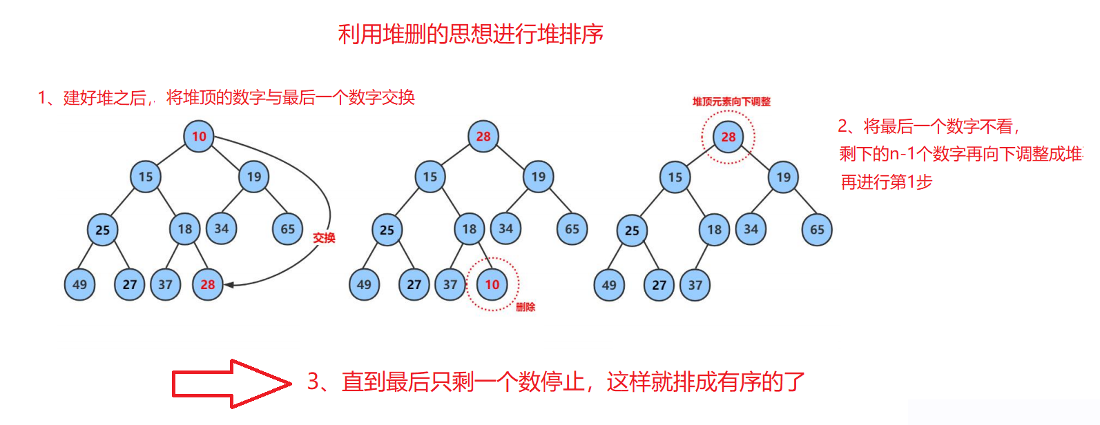 2、将堆顶元素和最后一个元素交换,然后将剩下的节点重新构造成一个大堆;